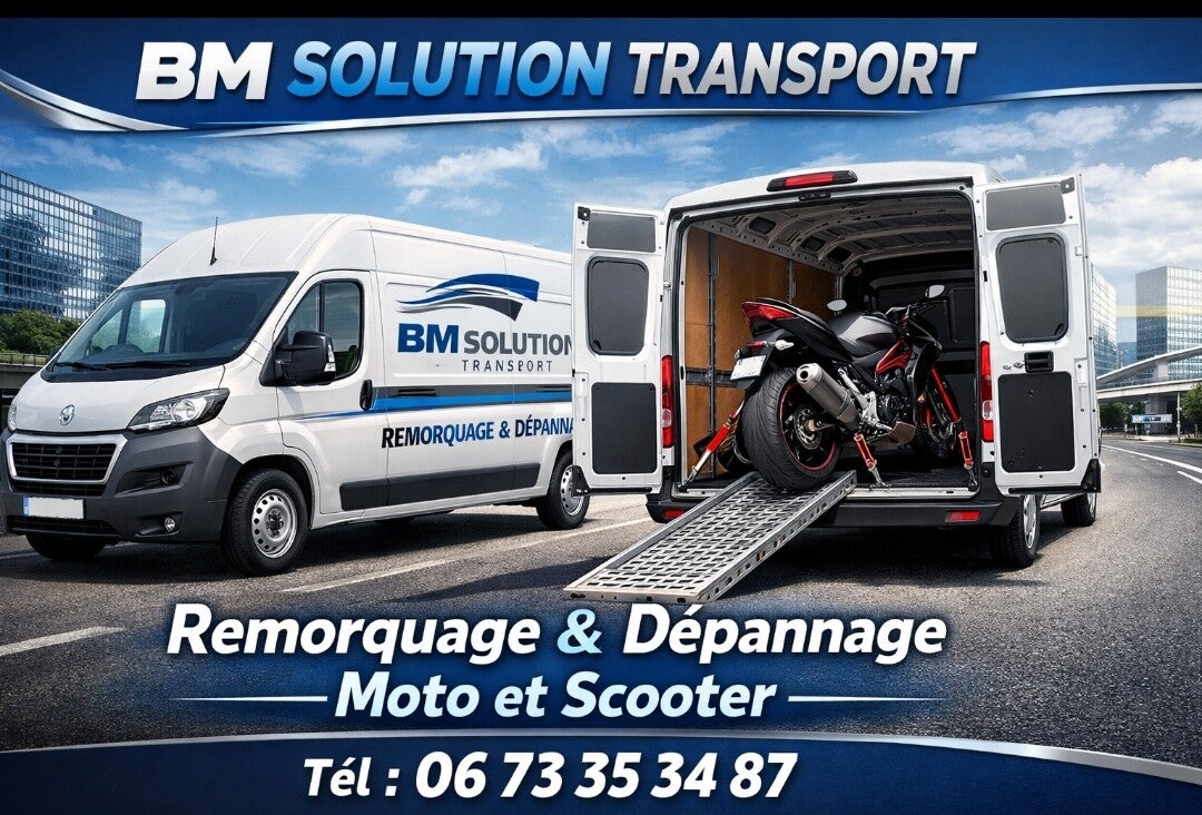 BM Solution Transport est spécialisé dans le dépannage et le remorquage de deux-roues (motos, scooters, quads, cyclomoteurs) à Paris et dans toute l'Île-de-France.Nous garantissons un service rapide, fiable et abordable pour tous vos besoins de transport et d’assistance en cas de panne ou de sortie de fourrière.